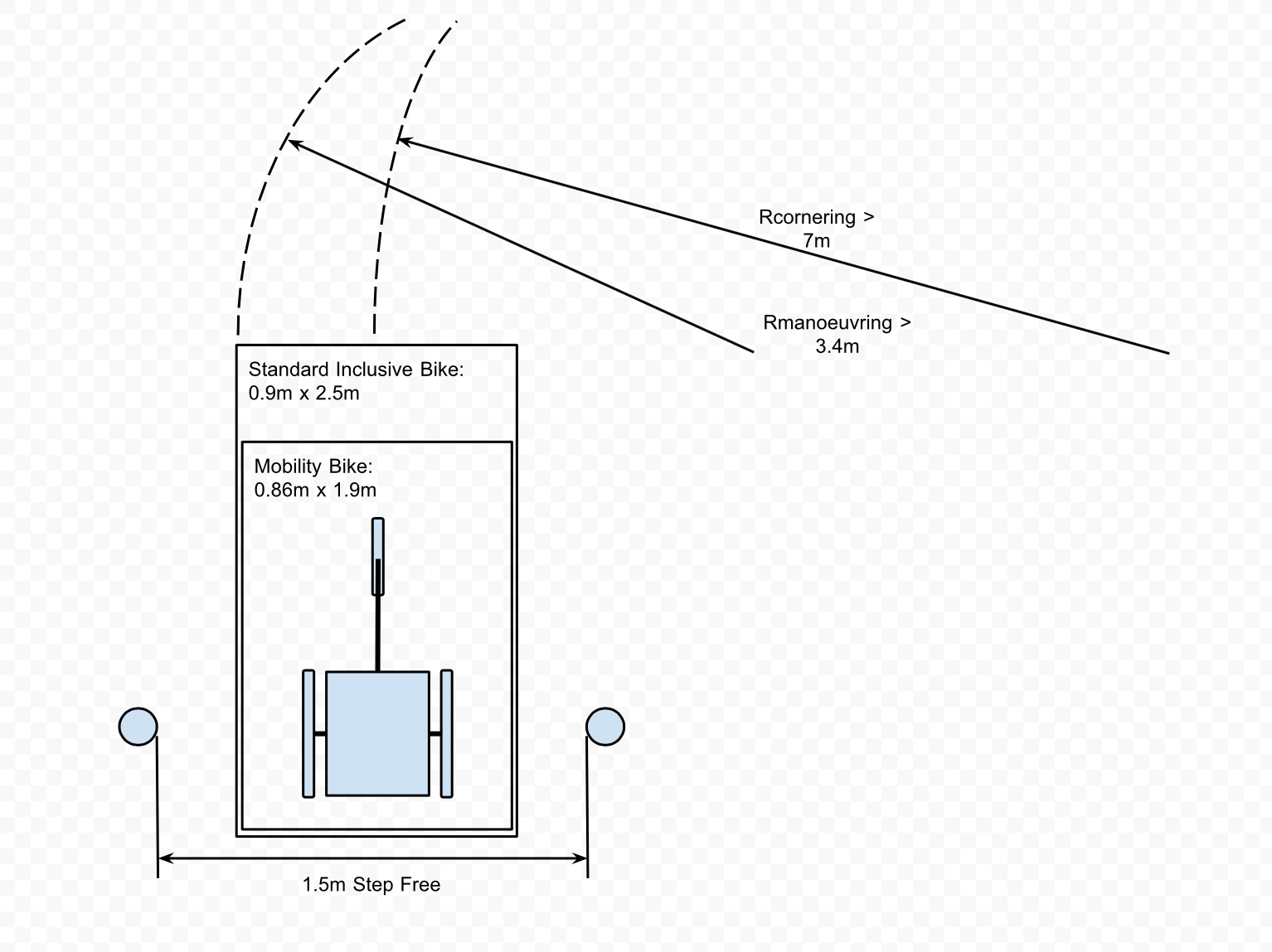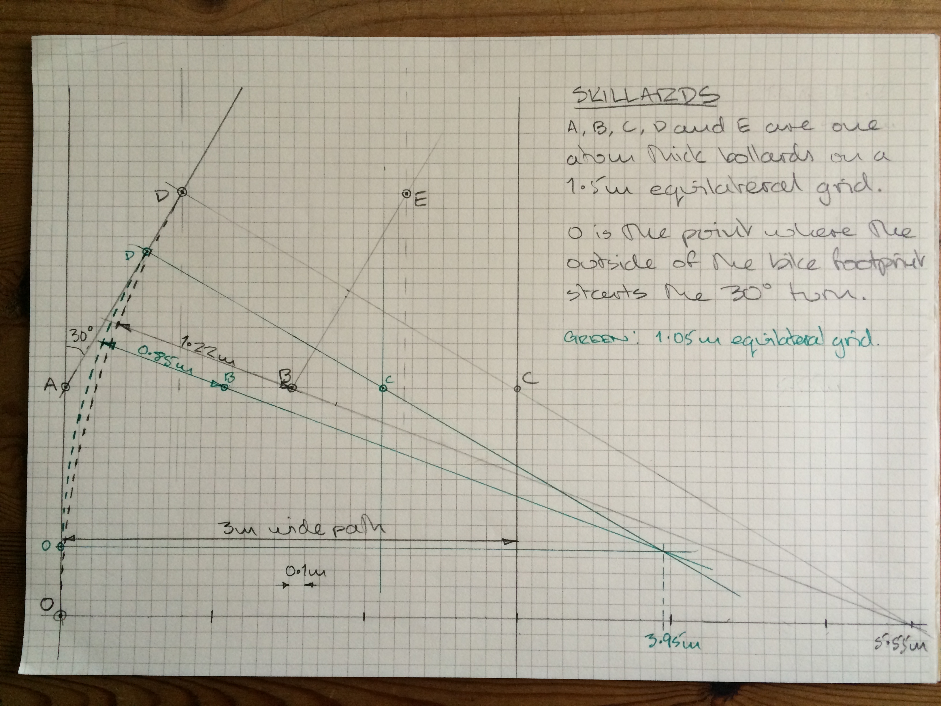 I put aside my experience of riding in the Netherlands where obstructions are rare, and conceded that a skillard is probably less restrictive than overlapping gates for trikes, handbikes, tandems etc. To reach a rational conclusion I decided to have a go at calculating if this new barrier design is compatible with the spec we’ve been developing for a Standard Inclusive Bike.