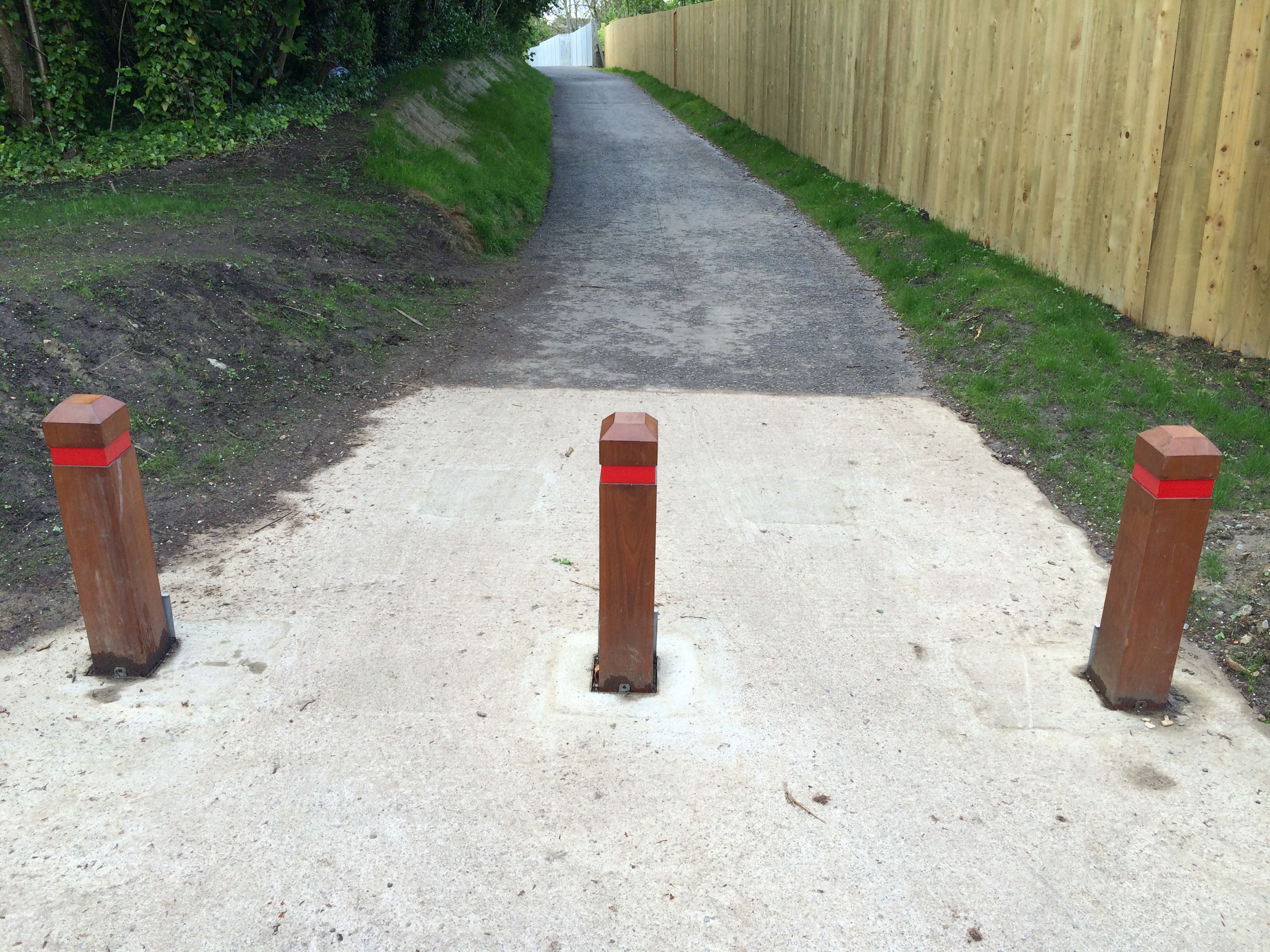 These are views looking east-ish from the skillard4 at the end of Inverness Road, and west-ish from the skillard5 adjacent to Bellotts Road. Every bollard in this location has a clear gap of about 1.2m to its neighbours.