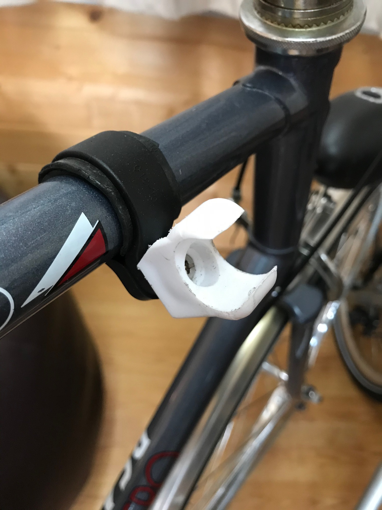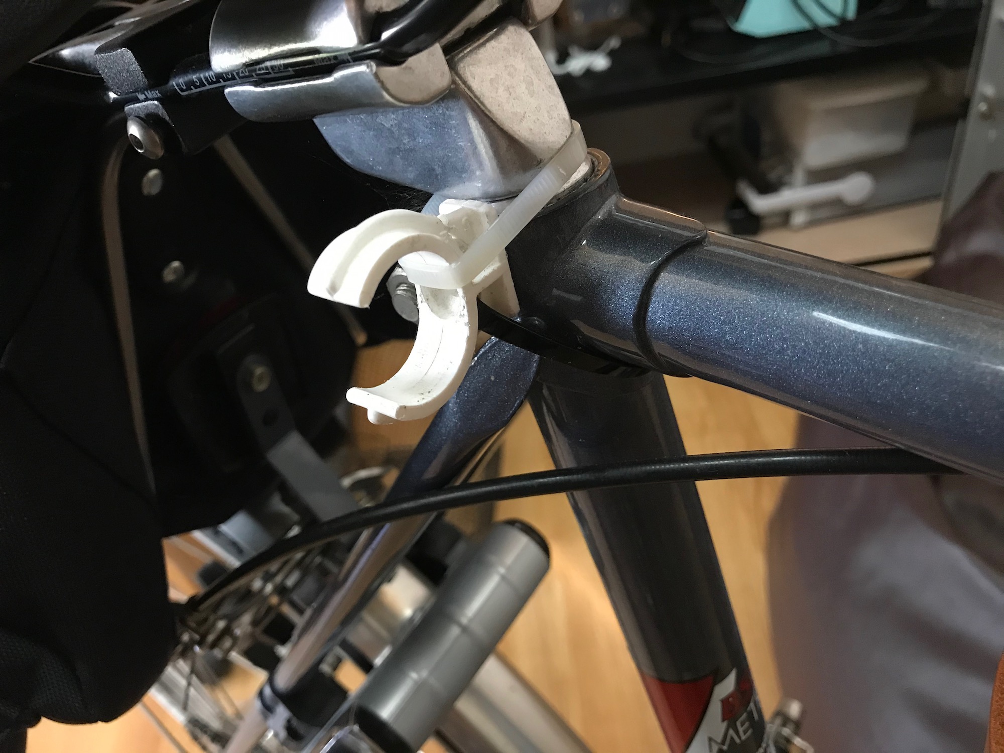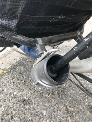 The front pipe clip (which might be a 15mm rather than 22mm) is attached to the crossbar using a light or reflector mounting, and the rear 22mm one to the seat post/tube with cable ties. Not sure why I didn’t use the slot I’d cut for one of cable ties, but it works. (A bike stand is very useful too, if you can operate it.)