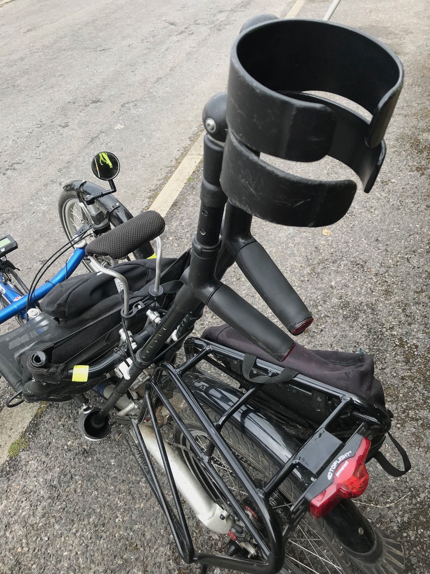 On my recumbent trike I’ve mounted a couple of water bottle holders behind the seat which I drop the ferrules of the crutches into. I filed a slot in the pipe clips for the cable ties and I’ve found I need the shock cord to keep the crutches in place else they can pop out on rough roads.